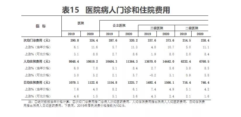 (一)医院病人医药费用。2020年,医院次均门诊费用324.4元,按当年价格比上年上涨11.6%,按可比价格上涨8.8%;人均住院费用10619.2元,按当年价格比上年上涨7.8%,按可比价格上涨5.2%。日均住院费用1122.6元(见表15)。