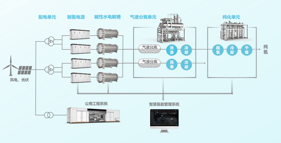 阳光氢能为该项目提供先进的柔性制氢系统解决方法,包括3套四对一柔性制氢系统(4台1000Nm³/h碱性水电解槽对应1套4000Nm³/h气液分离与纯化设备)、智慧氢能管理系统等产品。为满足不同能量来源对设备的影响以及规模化产氢对技术要求,结合绿氢合成氨的应用场景,研发团队多次实地考察,并将四对一解决方案与项目需求反复论证。最终,以其雄厚的研发实力、专业的服务和对产品质量的严格把控,获得业主好评。